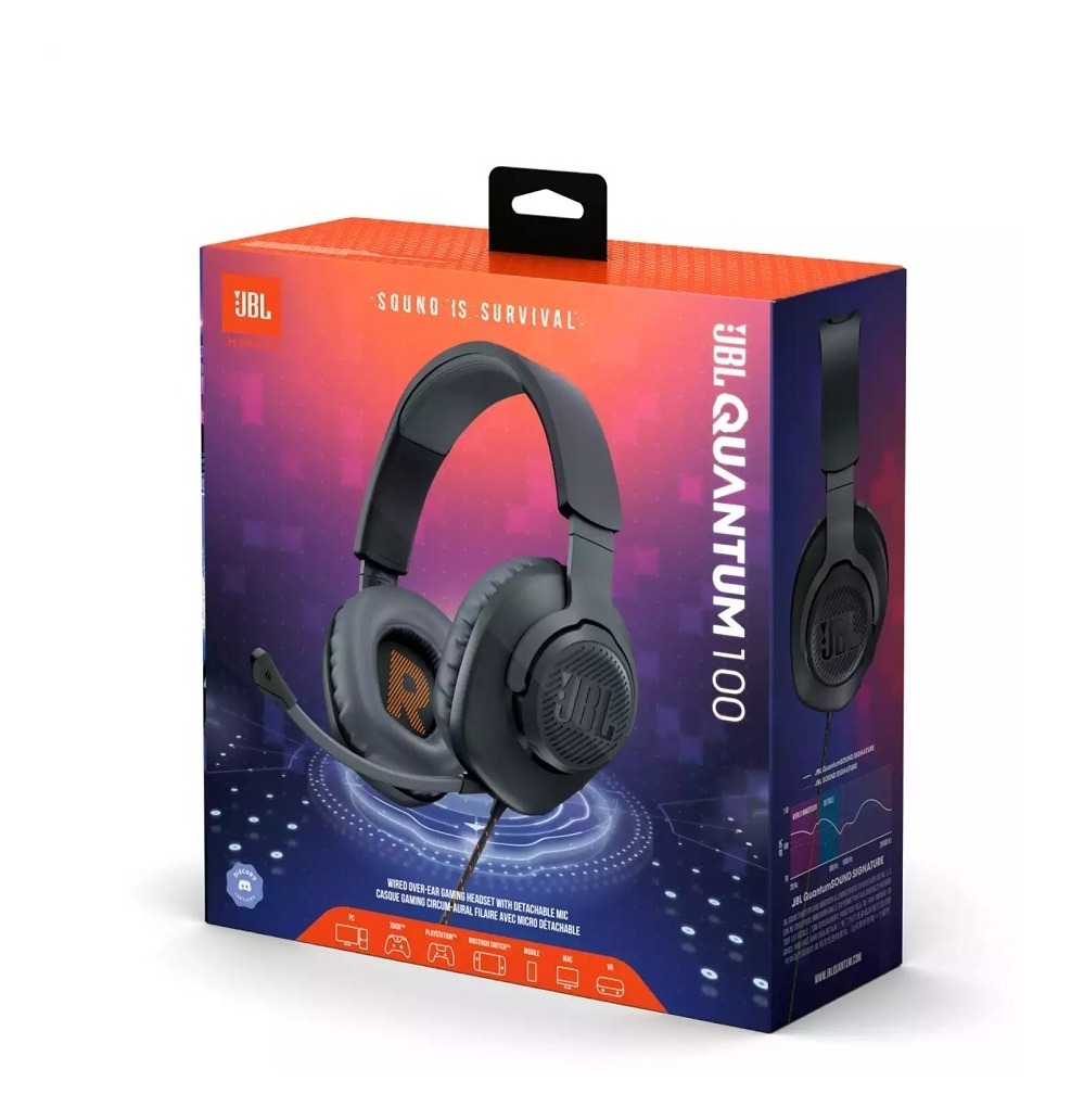 Convierta el juego en una aventura épica. Con el nuevo estándar JBL QuantumSOUND Signature, los auriculares JBL Quantum 100 le sitúan en el centro de la acción. Un sonido inmersivo y preciso que le permite apreciar todos los matices y sentir todas las explosiones, un micrófono vocal extraíble, y comodidad y ligereza gracias a las almohadillas de espuma viscoelástica. El micrófono de asta desmontable le permite interactuar con varios jugadores y las almohadillas de espuma viscoelástica proporcionan un óptimo confort durante horas. Juegue partidas inolvidables con los auriculares JBL Quantum 100.