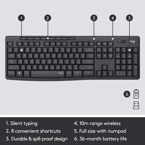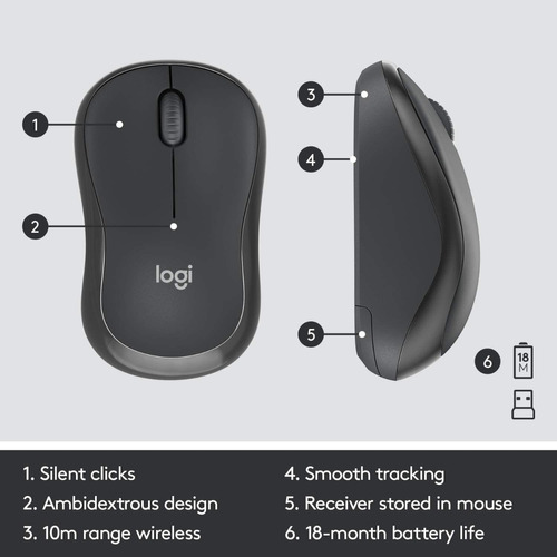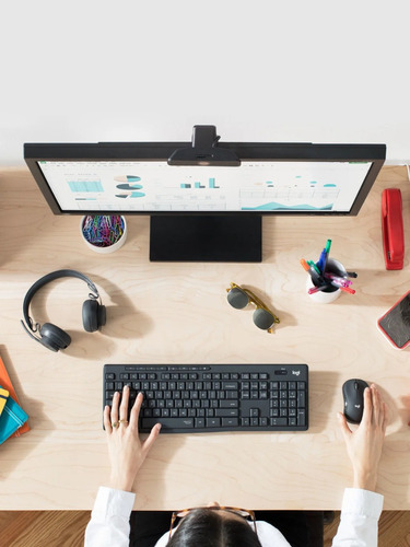 La combinación inalámbrica silenciosa Logitech MK295 incluye SilentTouch, una tecnología exclusiva de Logitech que elimina más del 90% del ruido producido por teclados y mouse. Ofrece la misma sensación de click y escritura que la mejor combinación de todas y sin molestos ruidos al hacer click o escribir.