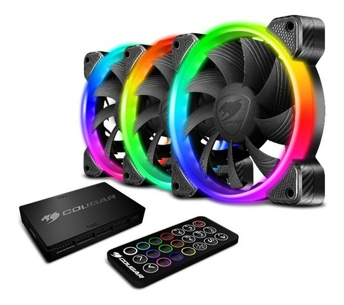 VORTEX RGB HPB 120 Kit de Refrigeración con tecnología PWM y HDB El Vortex RGB HPB 120 Cooling Kit trae refrigeración silenciosa de primer nivel y una potente iluminación tridireccional RGB. Este potente conjunto incluye la COUGAR Core Box, un controlador remoto y tres ventiladores Vortex RGB HPB 120, ¡todo lo que necesitas para crear un potente equipo RGB! Iluminación Tridireccional In-Front-Out. Los 18 LEDs RGB de los ventiladores Vortex RGB HPB 120 producen un espectáculo brillante en tres direcciones. Mientras que la mayoría de ventiladores retroiluminados proyectan su luz sólo hacia el interior y el frente, Vortex RGB HPB 120 te trae un ángulo de 180º, cubriendo toda el área visible de fuera de tu caja.