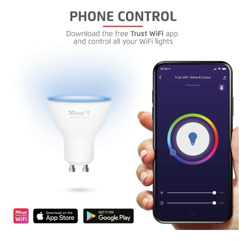 Bombilla inteligente LED blanca y de color con wifi GU10 para iluminación focalizada, que puede controlarse a través del teléfono o la tableta. Conexión mediante wifi (2,4 GHz), no requiere hub.