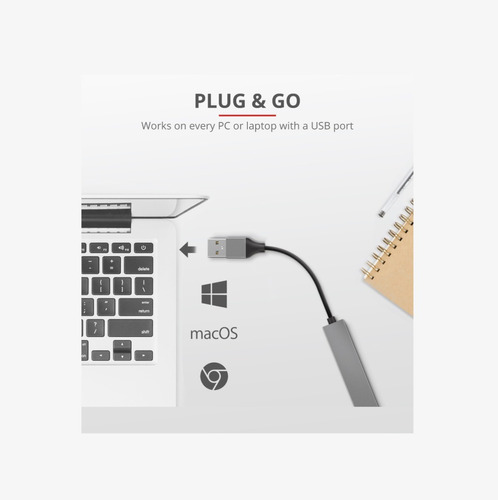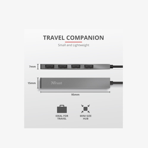 El Halyx de Trust funciona con todo tipo de portátiles, MacBooks, PC y tabletas* que tengan un puerto USB. Utilizando un único puerto USB-A en el dispositivo, se pueden añadir 4 dispositivos USB, como el teclado o una unidad externa. El Halyx permite transferir datos rápidamente (USB 2.0) y este práctico complemento no requiere la instalación de ningún software: solamente hay que conectar, ¡y listos!