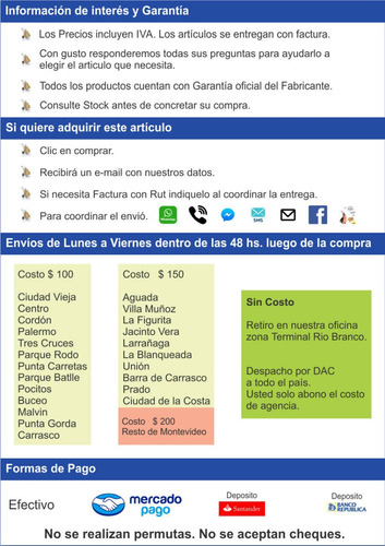 * Para tu mayor comodidad puedes pagar todos nuestros productos a través de Mercado Pago, con tarjetas de crédito VISA – MASTERCARD – OCA – DINERS CLUB – LIDER – SCOTIABANK – CREDITEL o redes de cobranza (RED PAGOS – ABITAB).