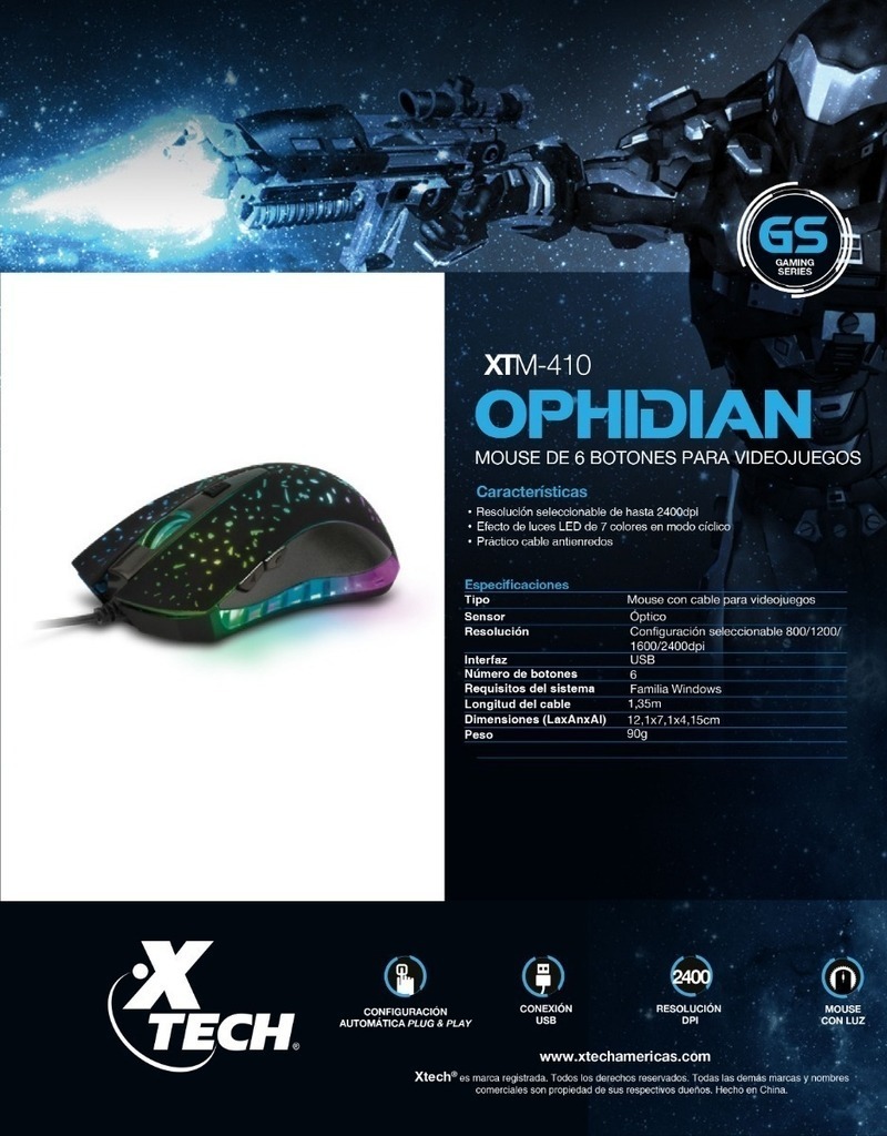 Mouse Gamer Usb 2400ppp 6 Botones Iluminado Xtm-410 Backup