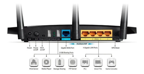 Un puerto USB 2.0 convierte al Archer C7 en una puerta de enlace verdaderamente ingeniosa. Comparte un disco duro lleno de medios a través de la red doméstica o mediante un servidor ftp cuando estés fuera.