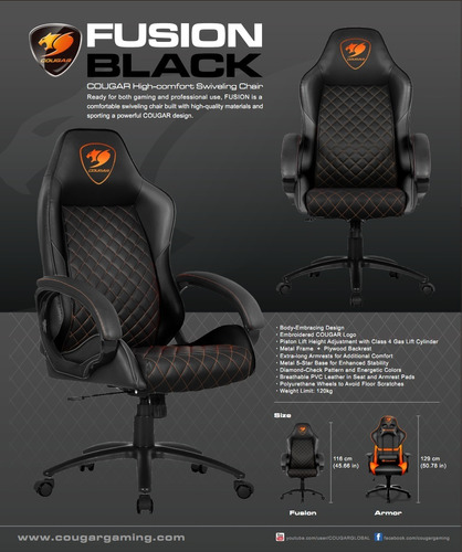 SILLA COUGAR FUSIÓN SILLA DE JUEGO DE ALTO CONFORT Preparada tanto para juegos como para uso profesional, FUSION es una cómoda silla giratoria construida con materiales de alta calidad y con un potente diseño COUGAR. El diseño envolvente del cuerpo de Fusion ofrece una agradable experiencia de asiento que se ve reforzada por sus reposabrazos extra largos. Tanto el cuerpo de la silla como las almohadillas del reposabrazos tienen una superficie de piel sintética que los hace transpirables y muy agradables al tacto. El patrón de diamantes del área de asientos y respaldo y la coloración de la silla cuidadosamente elegida y altamente energética hacen que sea un placer mirar y contribuir a generar una atmósfera que favorece la productividad.
