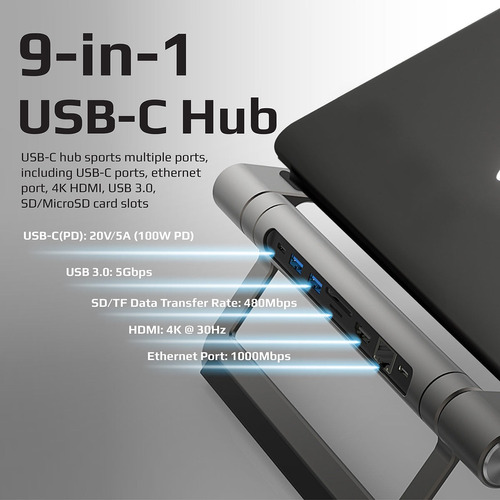Soporte para portátil con Hub USB-C multipuerto 9 en 1 Promate PrimeBase-C.