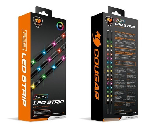 Tira de LED RGB Para ayudarlo a cubrir todas las áreas en las que desea bañarse con luz RGB, las tiras de LED COUGAR RGB son más largas que las que ofrece la mayoría de los competidores: con 15 LED por tira, hará el mejor uso de los conectores disponibles. ¡No quedará rincón en la oscuridad! Nota: Cuando se conecte a COUGAR Core Box, Core Box C o Core Box v2, la tira LED COUGAR RGB le permitirá elegir entre 100 efectos visuales sorprendentes que le darán a su caso una nueva vida. Si también tiene ventiladores Vortex RGB, los efectos en los ventiladores y las tiras de LED se pueden controlar y sincronizar de forma inalámbrica. Con Core Box C o Core Box v2, también es posible la conexión a la cabecera de 5v RGB de las placas base compatibles para la sincronización en todo el sistema. (Los CoreBox y Vortex se venden por separado)